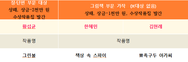올해에도 대상 수상작 1편을 내기보다는 더 많은 작가가 독자들의 평가를 받을 수 있는 기회를 드린다는 의미에서 <뾰족 구두 아가씨>와 <책상 속 스파이> 2편을 공동 가작으로 선정하기로 하였다. 마감일에 맞추어 제출하느라 아쉬웠던 부분들을 출판을 위해 다듬고 수정하는 과정에서 더욱 발전시켜서 그림책 독자들에게 널리 사랑받는 작품으로 완성해주시기를 바란다.